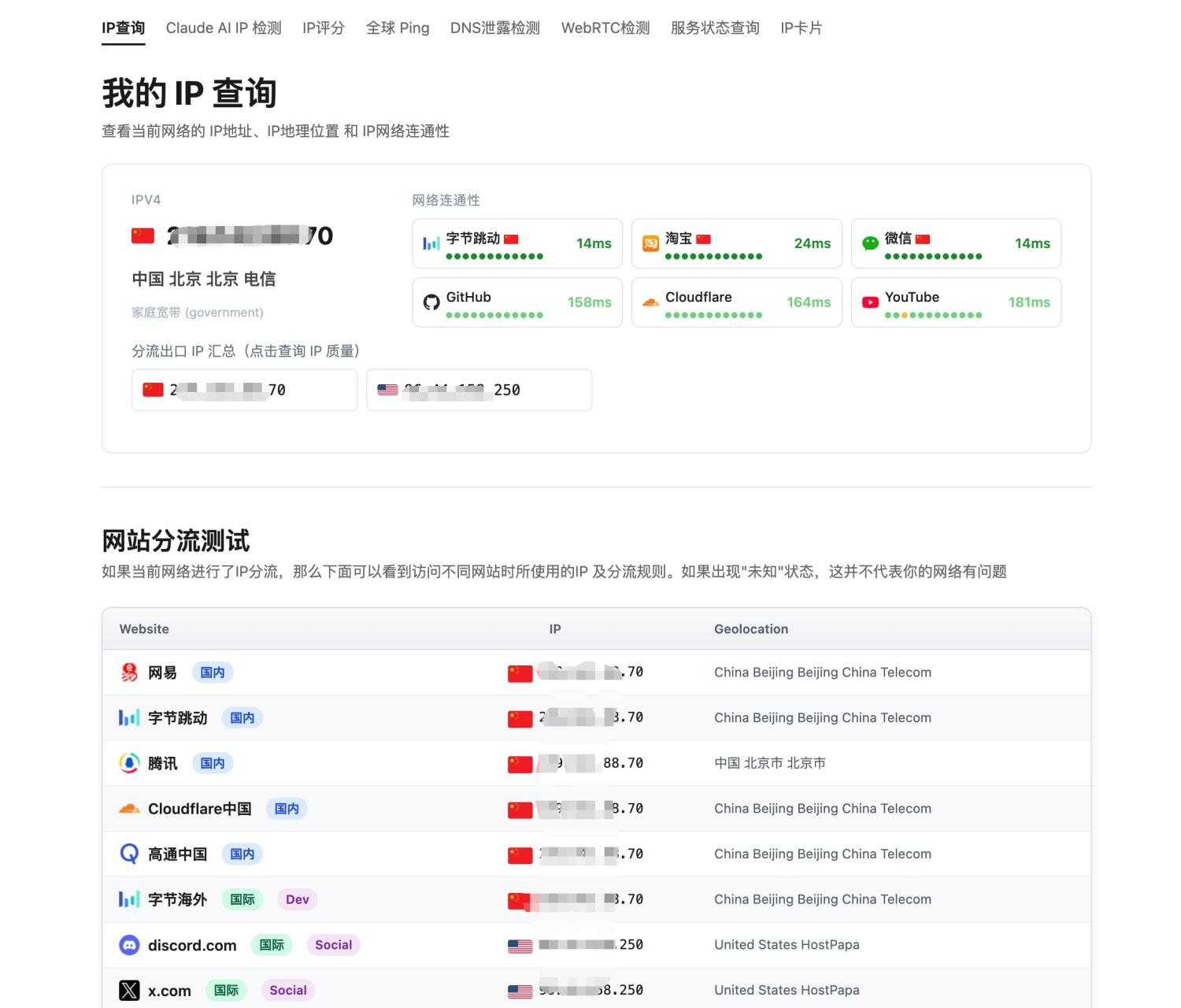 IP分流测试工具的核心功能简单直接:检测你的网络访问不同网站时,具体走了哪条线路、用了哪个 IP 出口。
